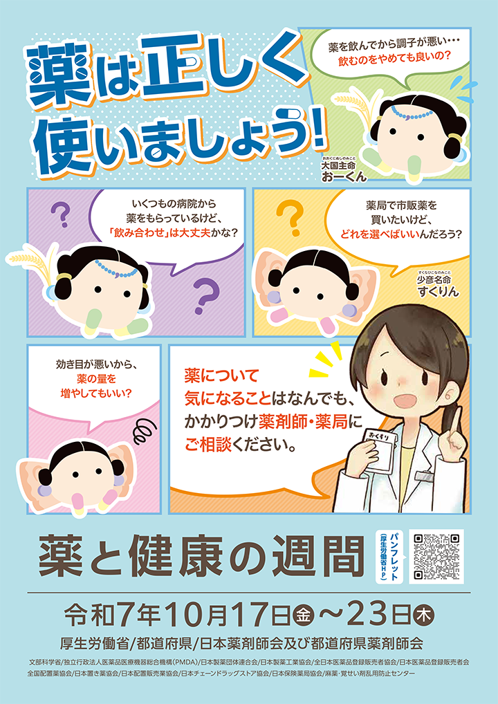 厚生労働省と日本薬剤師会が毎年10月17日から10月23日までの1週間に実施している「薬と健康の週間」は、国民が薬の正しい使い方を学び、健康的な生活を送るための啓発活動です。
